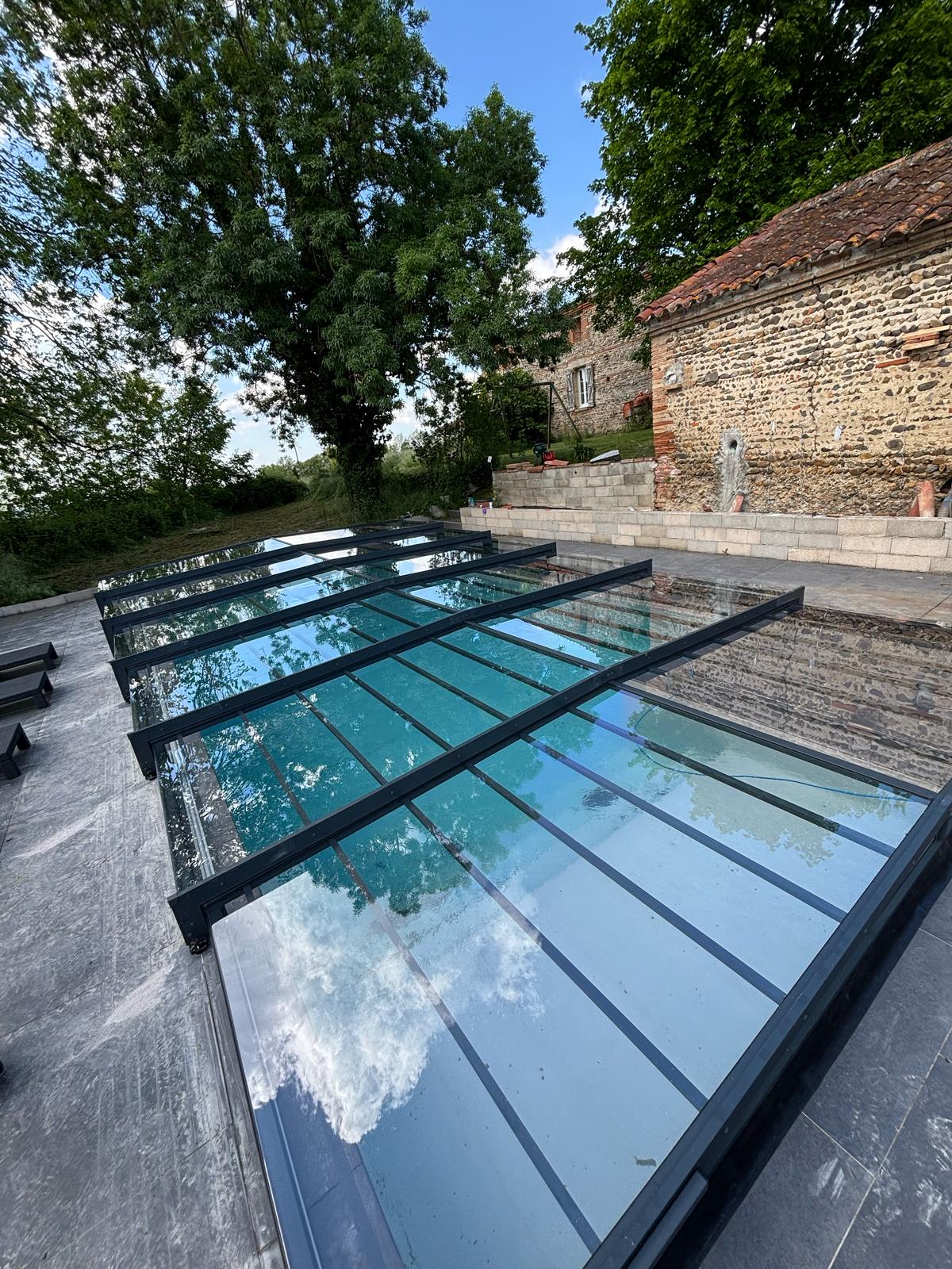 À Montauban, nous avons installé un abri bas de piscine couvrant un bassin de 10 mètres de long sur 5 mètres de large.